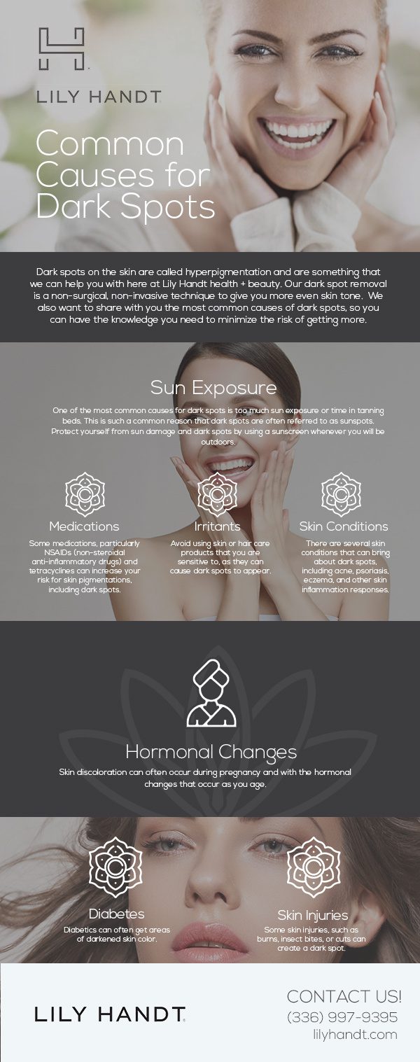 Dark spots on the skin are called hyperpigmentation and are something that we can help you with here at Lily Handt health + beauty. Our dark spot removal is a non-surgical, non-invasive technique to give you more even skin tone. If you would like to know more about this service, we welcome your call to schedule a consultation. We also want to share with you the most common causes of dark spots, so you can have the knowledge you need to minimize the risk of getting more.